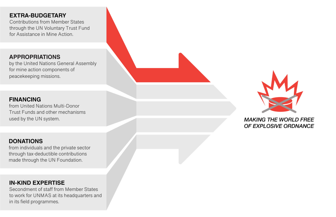 UNMAS is funded in several ways. When integrated into peacekeeping and special political missions, funding comes from assessed contributions, through appropriations made by the General Assembly. All other activities depend upon extra-budgetary resources provided by Member States through the United Nations Voluntary Trust Fund for Assistance in Mine Action (UN VTF) which was established by the General Assembly to act as an accountable, fast-track, low-cost mechanism to rid the world of the threat of landmines.