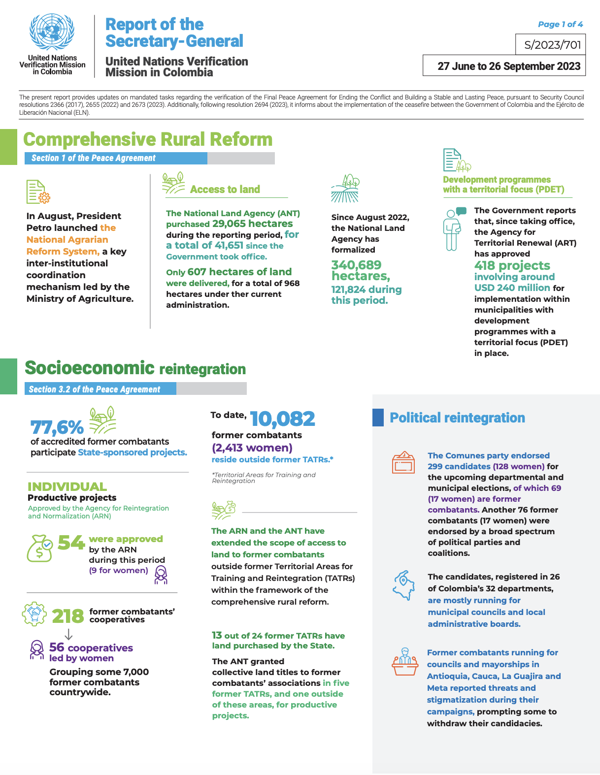 Infográficos Infographic Report of the Secretary-General on the UN Verification Mission in Colombia. S/2023/701
